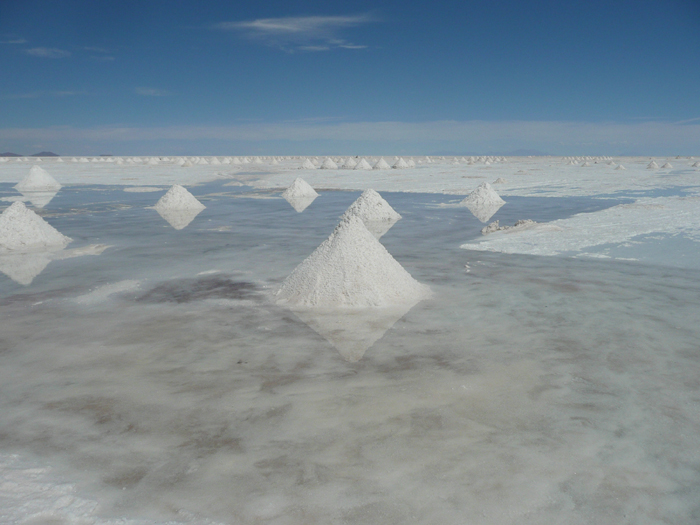 この大量の塩は、数100万年前に海の下に沈んでいたアンデス山脈が隆起した際に大量の海水がそのまま山の上に残されることとり、さらにこの地域は乾燥した気候であったこととウユニ塩湖が流出する川を持たなかったことにより、干上がってこのような広大な塩湖が出来たそうです。
