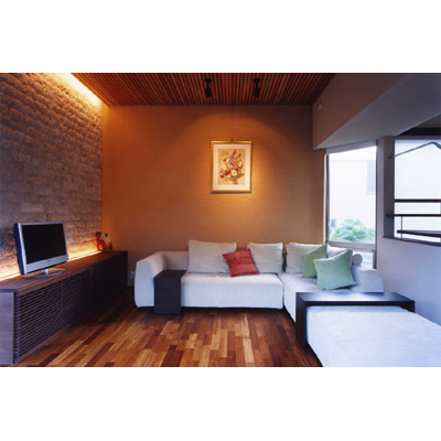 閑静な住宅地に位置するこの住宅では、プライバシーを保ちながら東側道路向いの隣地に立つ桜を借景としてどう取り込むかが計画の第1歩となりました。高さや面積に制約のある中で、より広く感じさせる為の工夫を随所に取り入れています。居間からデッキ越しに見える桜は一年を通して四季の移ろいを気づかせてくれる事でしょう。